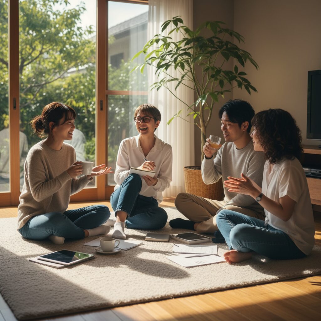 柔らかな日差しが差し込む休日の午後、私たちは大学時代からの親友4人で、マイホームを購入したばかりの美咲の家に集まっていた。リビングには、彼女が大切に選んだという大きなラグが敷かれており、その上でくつろぎながら、それぞれの近況や将来の夢について語り合うことになった。
