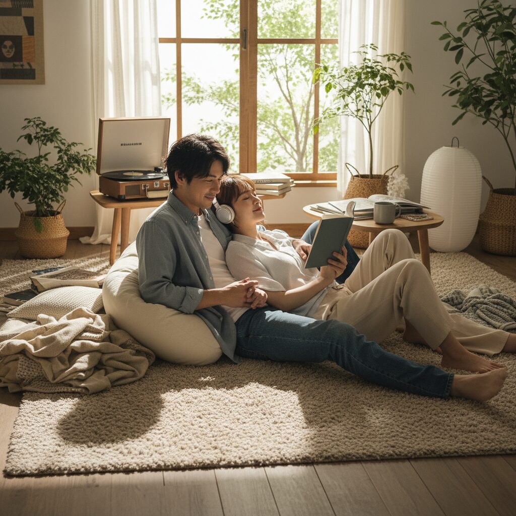 雨の日は、特にこのラグの上で過ごす時間が長くなる。窓の外で降る雨音を聞きながら、ホットココアを飲む。彼の肩に寄りかかると、彼の体温と心臓の音が伝わってくる。何も言わなくても、ここにいるだけで安心できる。結婚とは、こういう穏やかな時間を積み重ねていくことなのだと思う。