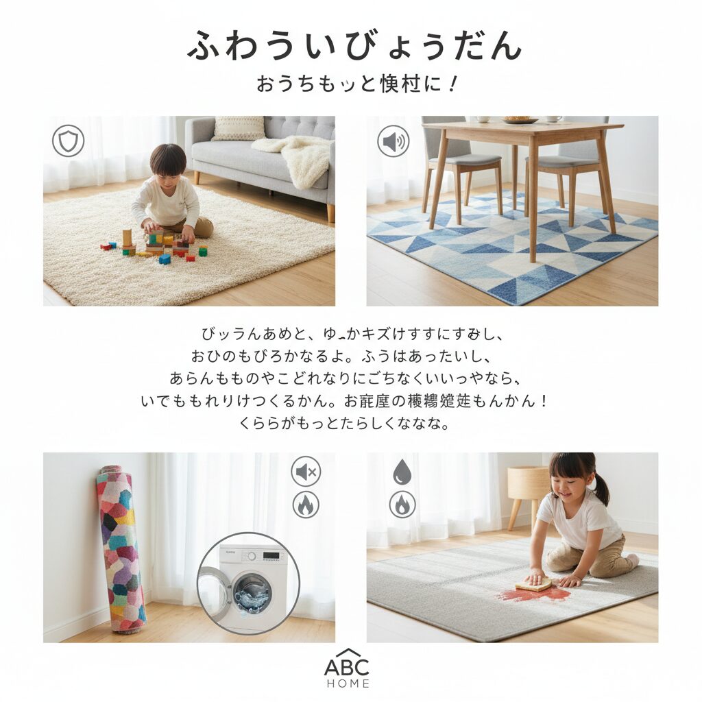 防音効果もラグの重要な機能のひとつです。集合住宅では上下階の生活音が問題になることがありますが、ラグは足音や物を落とした際の衝撃音を吸収し、階下への音の伝わりを軽減します。小さなお子様がいるご家庭では、走り回る足音を和らげることで、ご近所への配慮にもつながります。厚手のラグやクッション性の高い素材を選べば、より高い防音効果が期待できるでしょう。