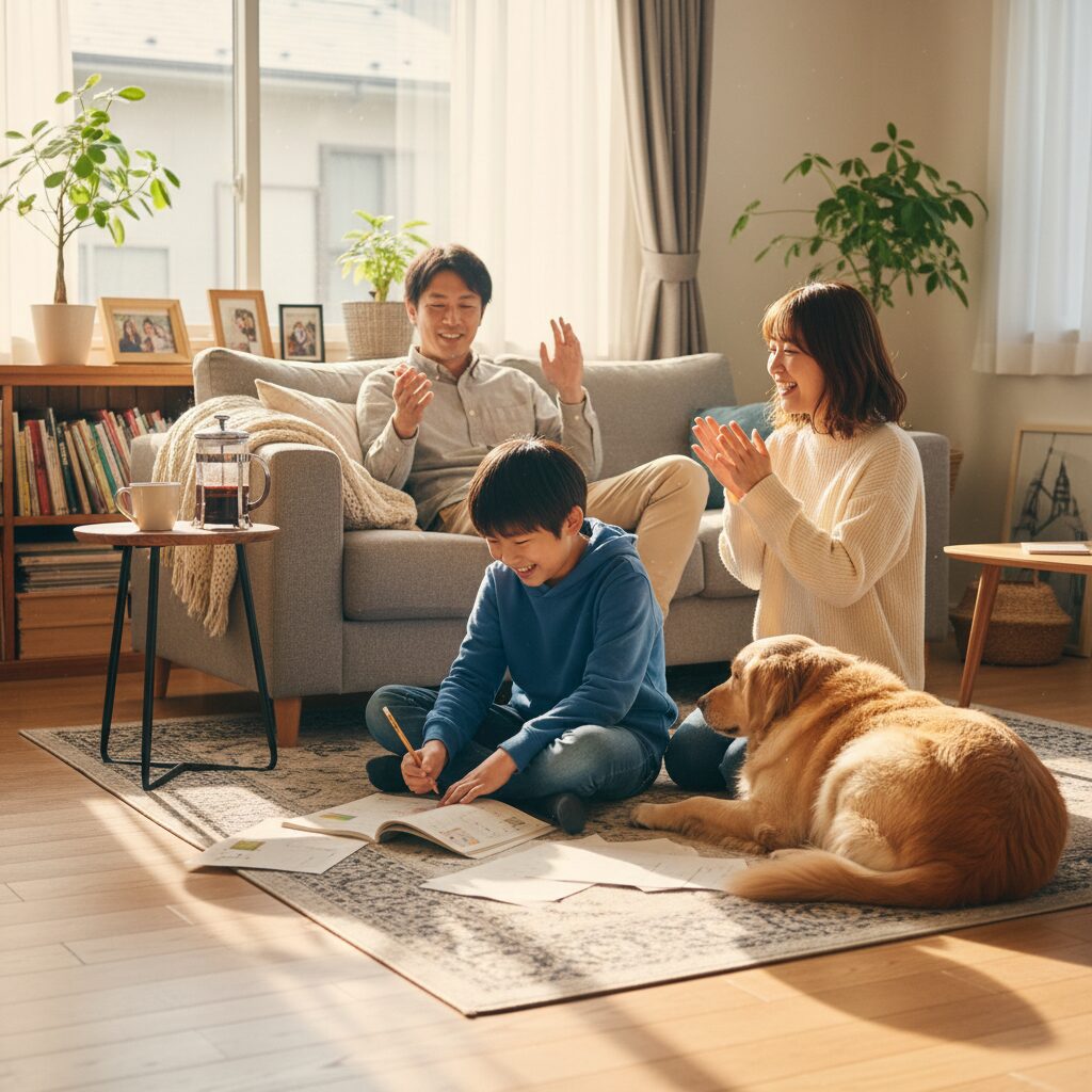 そこへ、ゴールデンレトリバーのハルが現れた。ハルはまだ二歳で、家族の誰かが集まっている場所には必ず顔を出す。ラグの端に寝そべると、大きなあくびをひとつして、前足を投げ出した。息子がその背中をぽんぽんと叩く。ハルは目を細めて、尻尾を二回だけ振った。