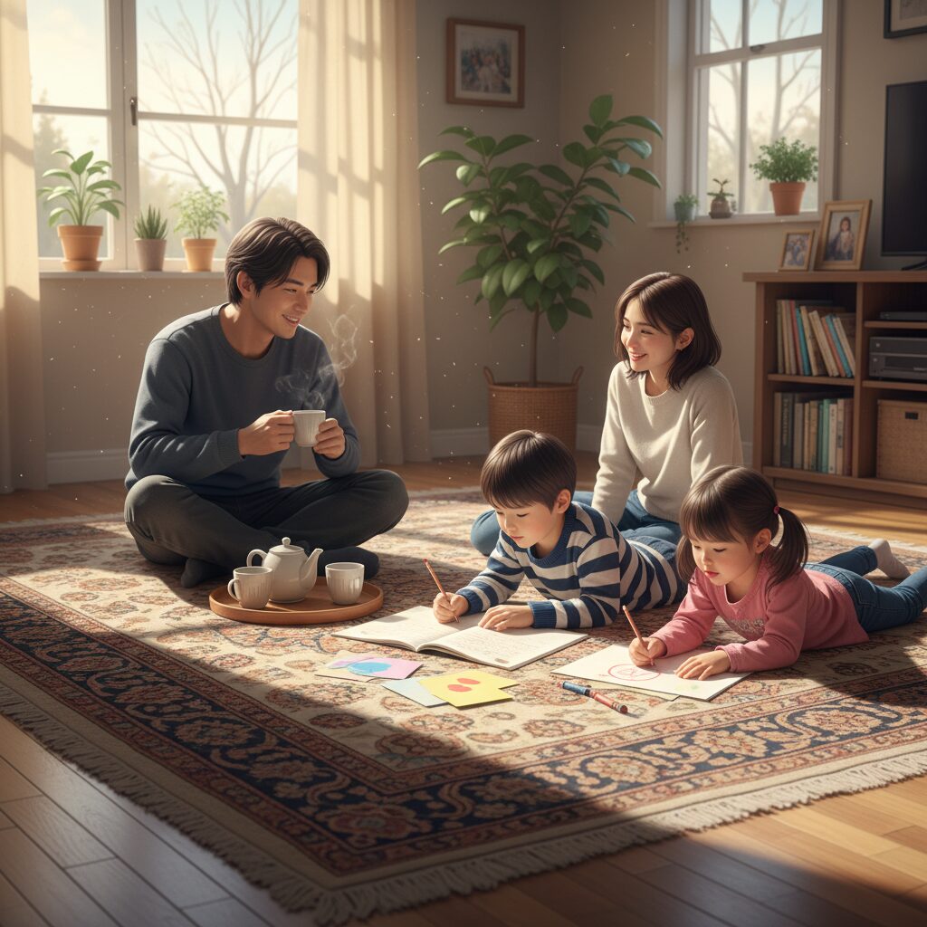 ラグの上には、家族それぞれの痕跡が静かに積み重なっている。父がうたた寝をしたときの体温の名残、兄がゲームをしながら寝そべった跡、妹が人形遊びをしたときに散らばったままのおもちゃ。そして今日もまた、新しい時間が刻まれようとしていた。
