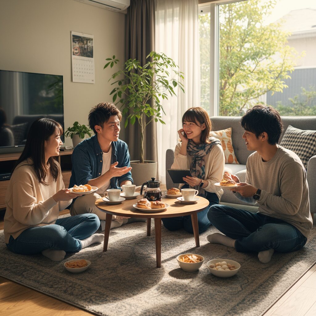 夕暮れ時の柔らかな光が窓から差し込むリビングルーム。そこに敷かれた一枚のラグの上に、四人の仲間が集まっていた。大学時代からの友人である彼らは、社会人になってからも定期的に集まり、近況報告や将来について語り合う時間を大切にしている。
