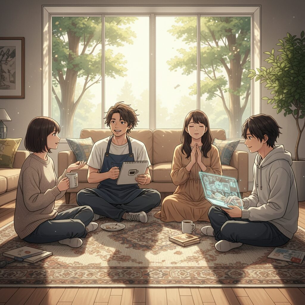 窓の外では、夕日が完全に沈み、街灯が灯り始めていた。ラグの上の四人は、まだまだ話し足りない様子で、次々と話題を変えながら語り合いを続けている。誰かの冗談に笑い声が響き、誰かの真剣な話に静かに耳を傾ける。