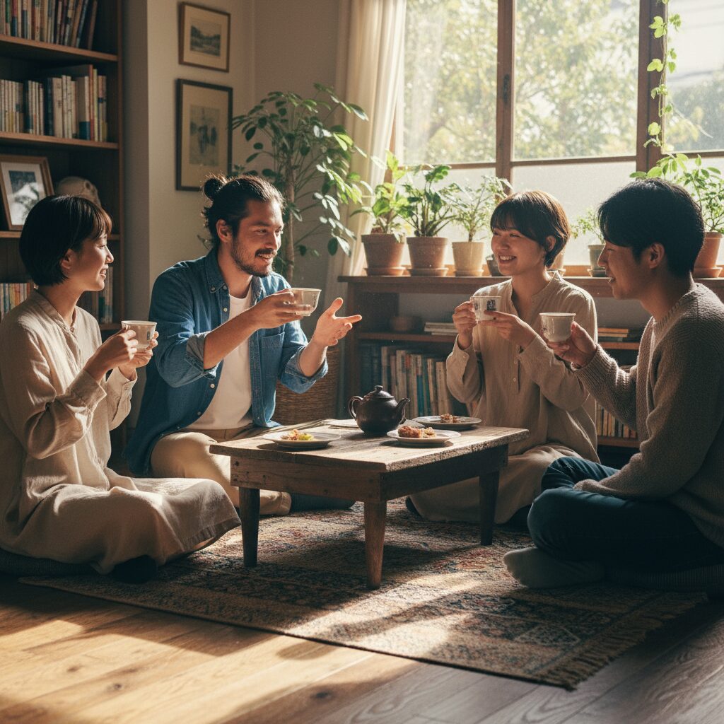 夜が深まり、部屋の照明が灯された。ラグの上の四人は、まだしばらく語り合いを続けた。仕事のこと、恋愛のこと、家族のこと、そして何より、これからの人生をどう生きていきたいか。そんな大切な話題を、気兼ねなく分かち合える仲間がいることの幸せを、四人は心から噛みしめていた。