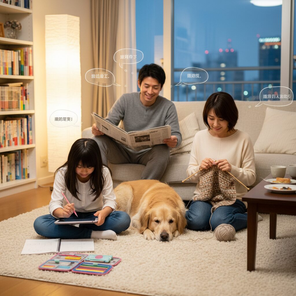 今日もまた、小学生の娘が宿題を広げ、夫は新聞を手に、私はお気に入りのクッションに寄りかかりながら編み物をしています。そして忘れてはならないのが、我が家の大切な一員であるゴールデンレトリバーのハナです。ハナは尻尾を大きく振りながら、ラグの上でお腹を見せてゴロンと横になりました。その仕草があまりにも愛らしくて、娘が思わず鉛筆を置いて撫でに行きます。