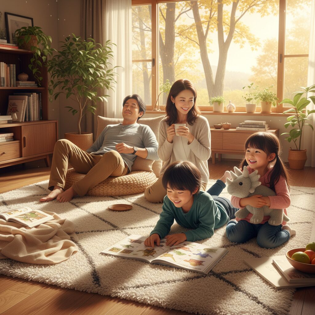 お父さんは背中をラグにつけて大の字になり、天井を見上げながら深呼吸をしていた。仕事帰りの疲れが少しずつほどけていくような、そんな表情だ。お母さんはその隣で膝を立てて座り、手元には温かい紅茶の入ったカップ。湯気が立ち上り、ほのかにアールグレイの香りが漂っている。男の子はラグの端にうつ伏せになって、図鑑を開きながら恐竜の名前を一生懸命読み上げていた。女の子はクッションに背中を預けて、ぬいぐるみを膝に抱えながら兄の話を聞いている。