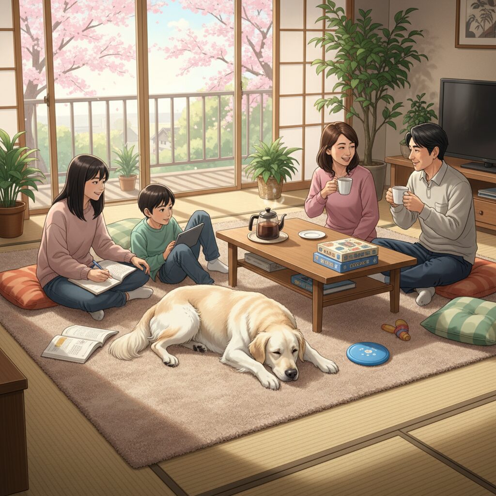 週末の午後、陽だまりの中でハルがラグの上で気持ちよさそうに寝そべっている姿を見ると、自然と家族全員がその周りに集まってきます。小学生の娘は宿題を広げ、中学生の息子はスマートフォンを脇に置いて、ハルの背中を撫でながらくつろいでいます。私と妻もコーヒーカップを手に、ラグの縁に腰を下ろします。特別な用事があるわけではありません。ただ、このラグの上にいると、なぜか心が落ち着き、家族との会話が自然と弾むのです。