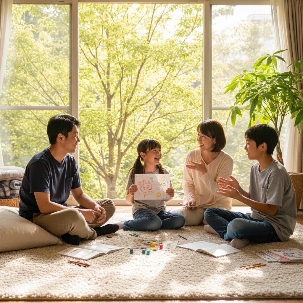 リビングの中央に敷かれた大きなラグの上で、私たち家族の一日が終わろうとしています。夕食の片付けを終えた後、自然と四人がこの柔らかな場所に集まるのが、我が家の習慣になっています。