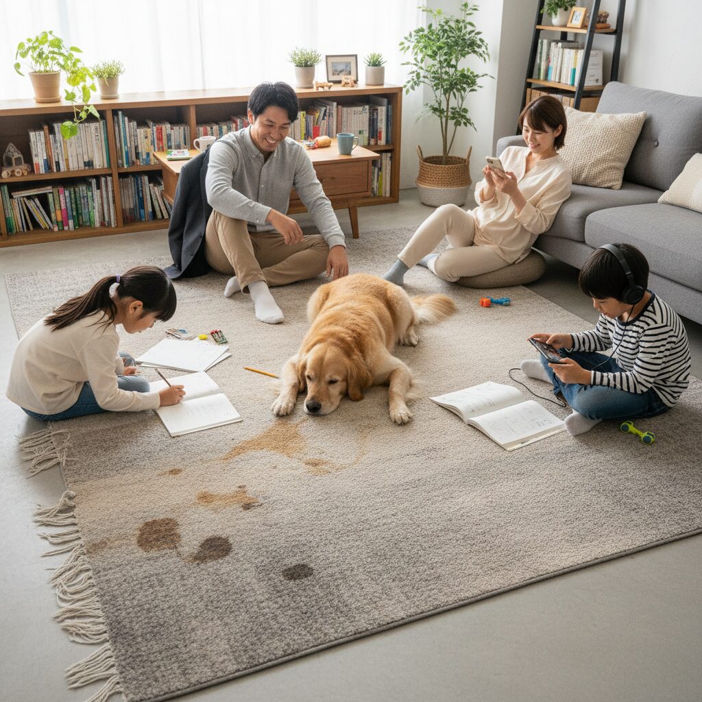 ソファもダイニングテーブルもちゃんとあるのに、気づくとみんなラグの上にいるんだよね。夕方6時過ぎ、仕事から帰ってくると大抵そんな光景が広がってる。娘は宿題を広げて寝転がってるし、息子はゲーム機を握りしめて座り込んでる。妻はクッションに背中を預けながらスマホで何か見てて、その真ん中にマックスがどーんと陣取ってる。誰も「ここに集まろう」なんて言ってないのに。