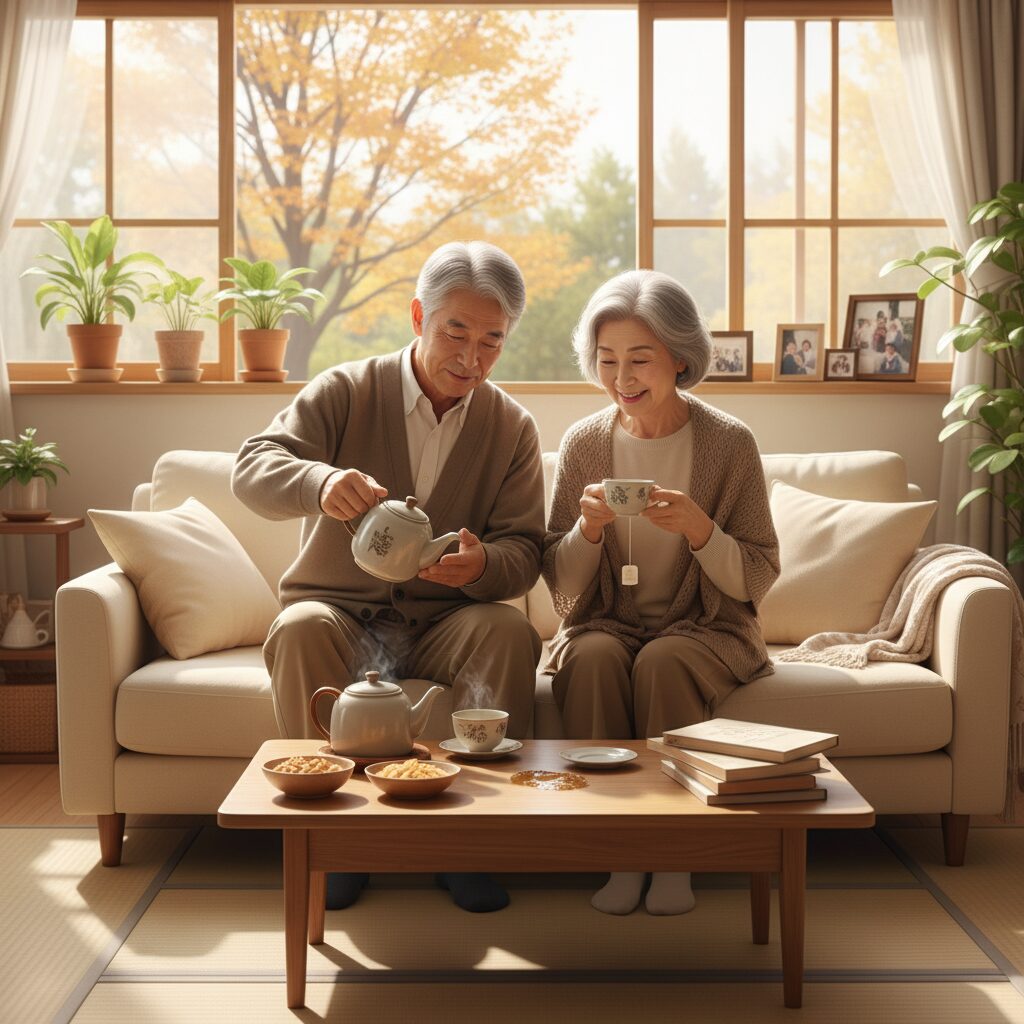 窓から差し込む十一月の午後の光が、リビングのラグの上にやわらかく広がっていた。その光は夏のそれとは違って、どこか控えめで、まるで遠慮がちに部屋の中へ滑り込んでくるようだった。私たち夫婦は、いつものようにソファに腰を下ろし、お茶を飲んでいる。彼が淹れてくれたほうじ茶は、香ばしい香りが鼻先をくすぐる。湯気が立ち上る様子をぼんやりと眺めながら、私は今日もまた、こうして一日が過ぎていくのだと思った。