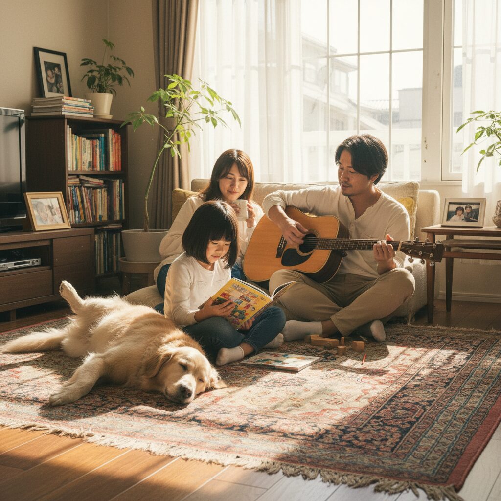 夕暮れが近づき、リビングの光は少しずつオレンジ色に染まっていく。ラグの上に家族が再び集まり、それぞれが好きな場所に座る。娘はハルの隣、妻は私の隣、そして私たちはみんな、このラグの上にいる。誰も言葉にはしないけれど、この場所が特別であることを、みんな知っている。