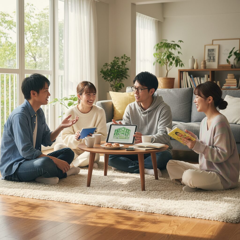 休日の午後、マンションの一室に広がるリビングで、ふかふかのラグの上に車座になって座る4人の姿があった。大学時代からの親友同士、太一、健司、美咲、そして玲奈。社会人3年目を迎えた彼らは、それぞれの道を歩みながらも、定期的に集まっては近況を報告し合い、夢を語り合うのが恒例となっていた。
