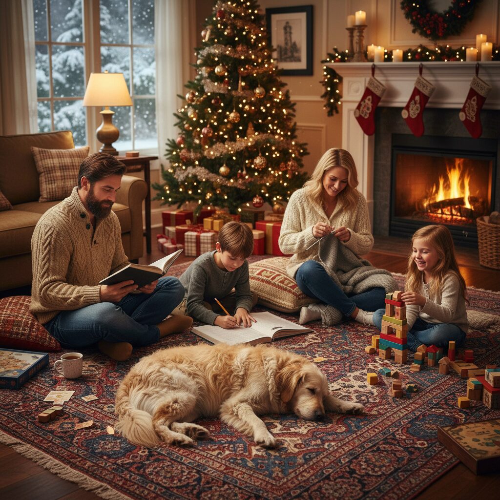 特に印象的なのは、私たちの家族の一員である大きなゴールデンレトリバーのマックスの存在です。彼はいつも家族が集まるラグの上で寝そべり、穏やかな表情を見せています。その大きな体で家族の足元を温めながら、時には子どもたちの遊び相手にもなってくれます。マックスの存在は、私たちの家族の団らんをより一層温かなものにしています。