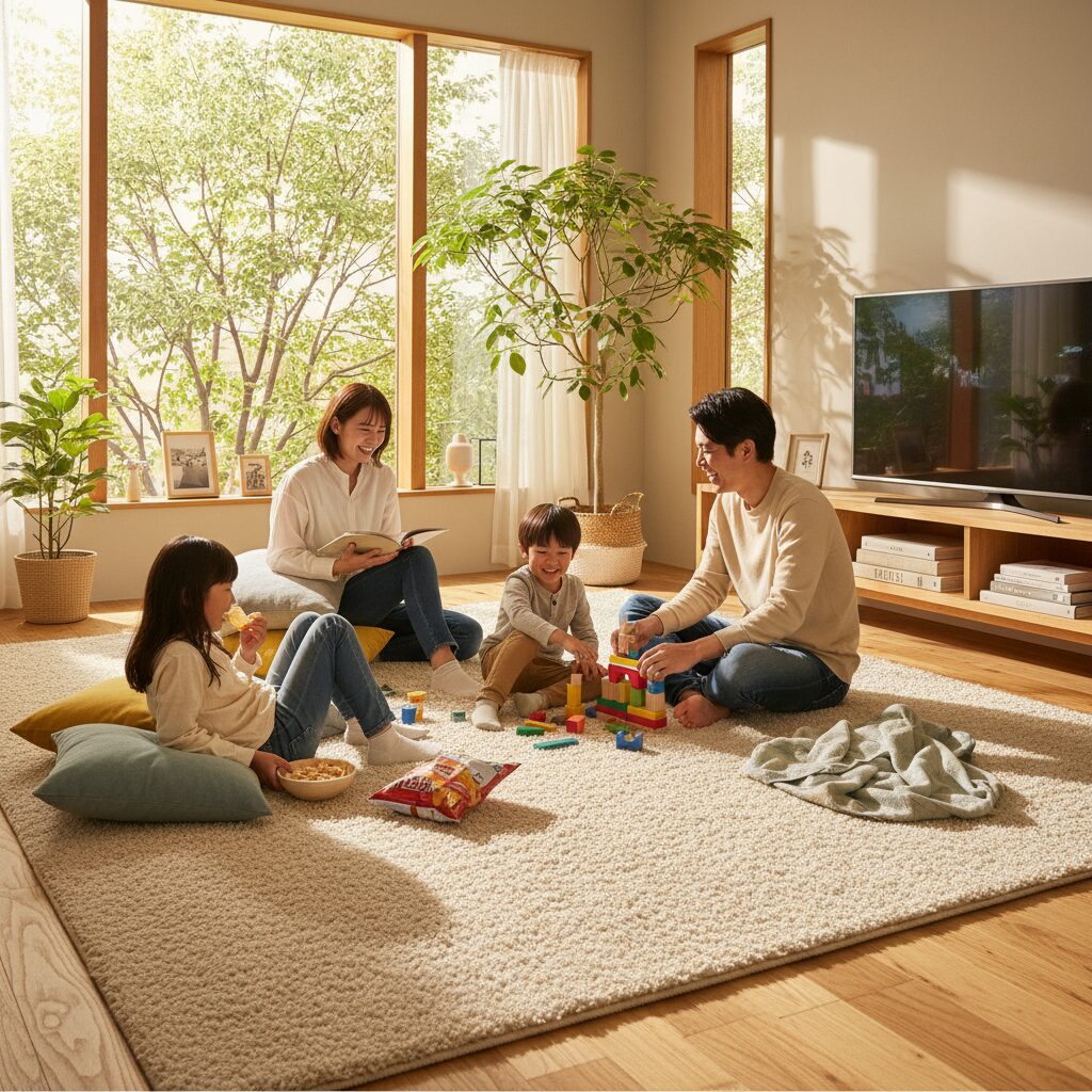 休日の午後、リビングに置かれた大きなラグの上で、私たち家族は穏やかな時間を過ごしていました。窓から差し込む柔らかな陽の光が、ふかふかのラグの上で戯れる子どもたちの姿を優しく照らしています。