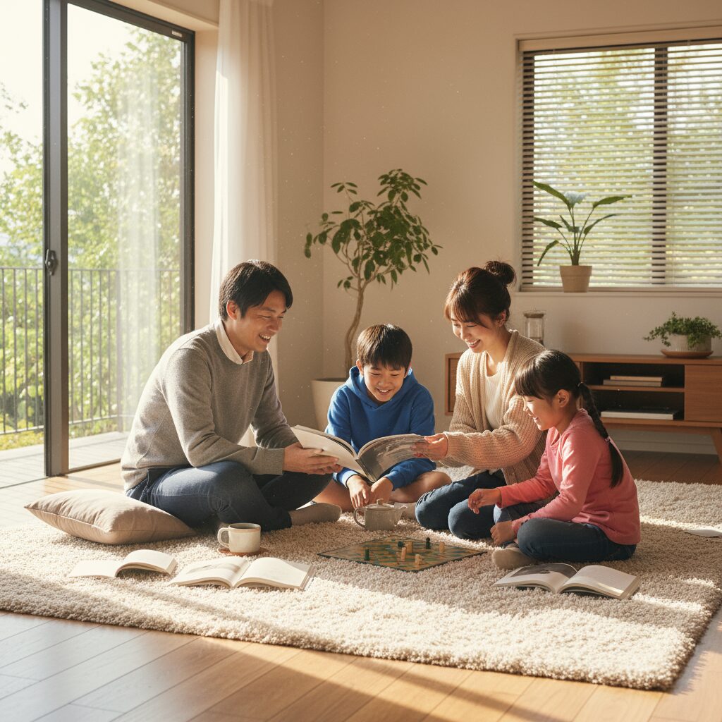 休日の午後、私たちはよくラグの上で本を読んだり、ボードゲームをしたりして過ごします。スマートフォンやテレビから離れ、家族で向き合う時間を大切にしているのです。時には健太が学校の宿題で困っていることを相談してきたり、美咲が友達との出来事を話してくれたりします。