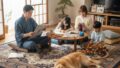 窓の外では冷たい風が吹く冬の夕暮れ時、私たちの家では特別な時間が流れています。リビングに敷かれた大きなラグの上で、家族みんなが寄り添うように集まっているのです。