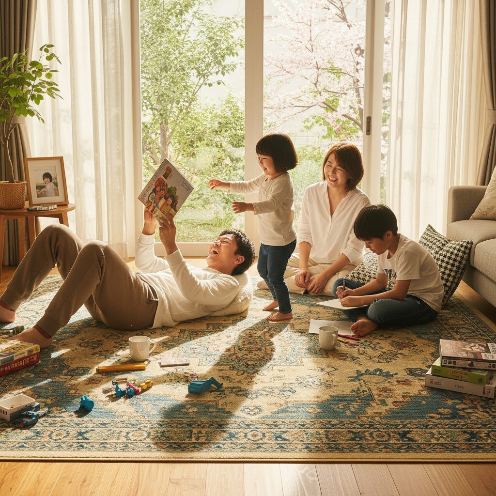 「そうだねぇ。お父さんも仕事から帰ってきて、このラグの上で横になると、一日の疲れが癒されるんだよ」と、私が答えると、横で寝そべっている妻が微笑みながら「でも、寝すぎて夕食の支度が遅くなることもあるわよね」とからかうように言いました。