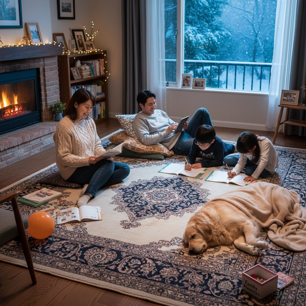 冬の夕暮れ時、リビングルームに広がる柔らかな温もり。大きなラグの上で、家族がそれぞれの時間を過ごしている光景は、まるで一枚の絵画のように美しい。
