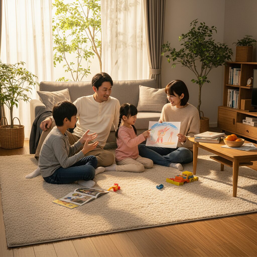 お父さんは仕事から帰ると、いつものようにネクタイを緩めてラグの上に腰を下ろします。「ただいま」という声に応えるように、お母さんがキッチンから温かいお茶を運んできます。小学生の男の子は宿題を終えたばかりで、まだ教科書を片手に持ったまま。幼稚園に通う女の子は、お気に入りのぬいぐるみを抱えて、すでにラグの真ん中で待っていました。