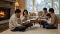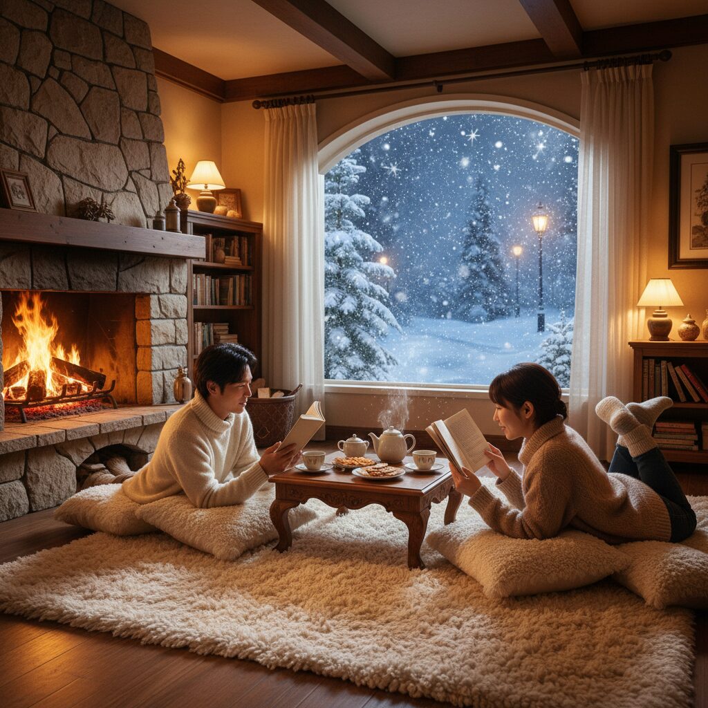 窓の外では雪が静かに舞い落ちる冬の夜。暖炉からは柔らかな炎の温もりが部屋全体に広がり、私たちの心を優しく包み込んでいます。足元に敷かれた上質なラグの上で、私たちは穏やかな時間を過ごしています。