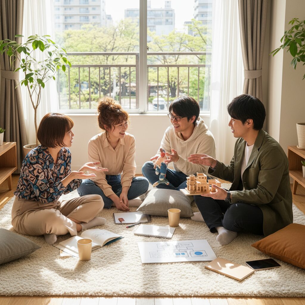 春の柔らかな陽射しが差し込む休日の午後、マンションの一室に集まった4人の若者たちは、ふかふかのラグの上でくつろいでいた。大学時代からの親友である彼らは、それぞれの道を歩み始めながらも、定期的に集まっては互いの近況を語り合うのが恒例となっていた。