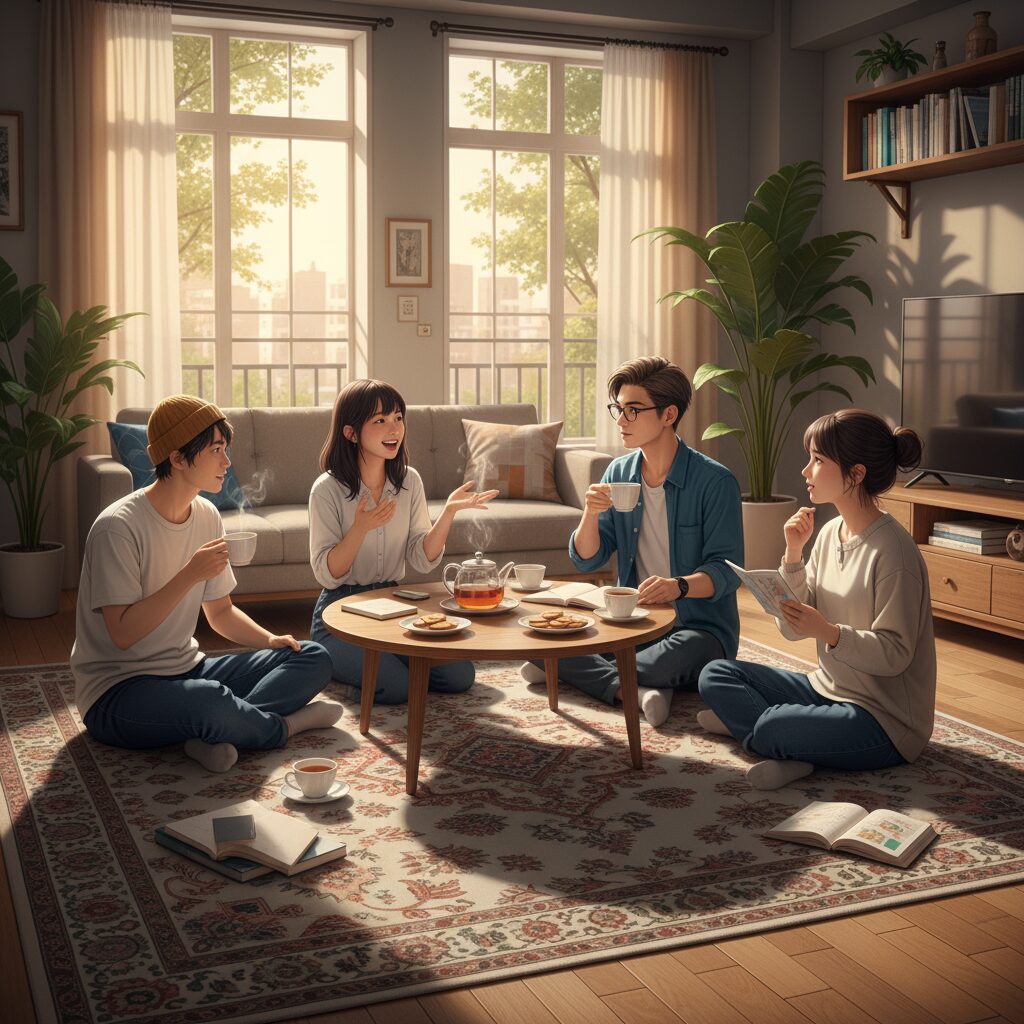夕暮れ時のアパートの一室。大きな窓から差し込む柔らかな光が、部屋の中央に敷かれたふかふかのラグを優しく照らしていた。そこには4人の若者たちが車座になって座り、それぞれの手にはほうじ茶の入った湯呑みがあった。