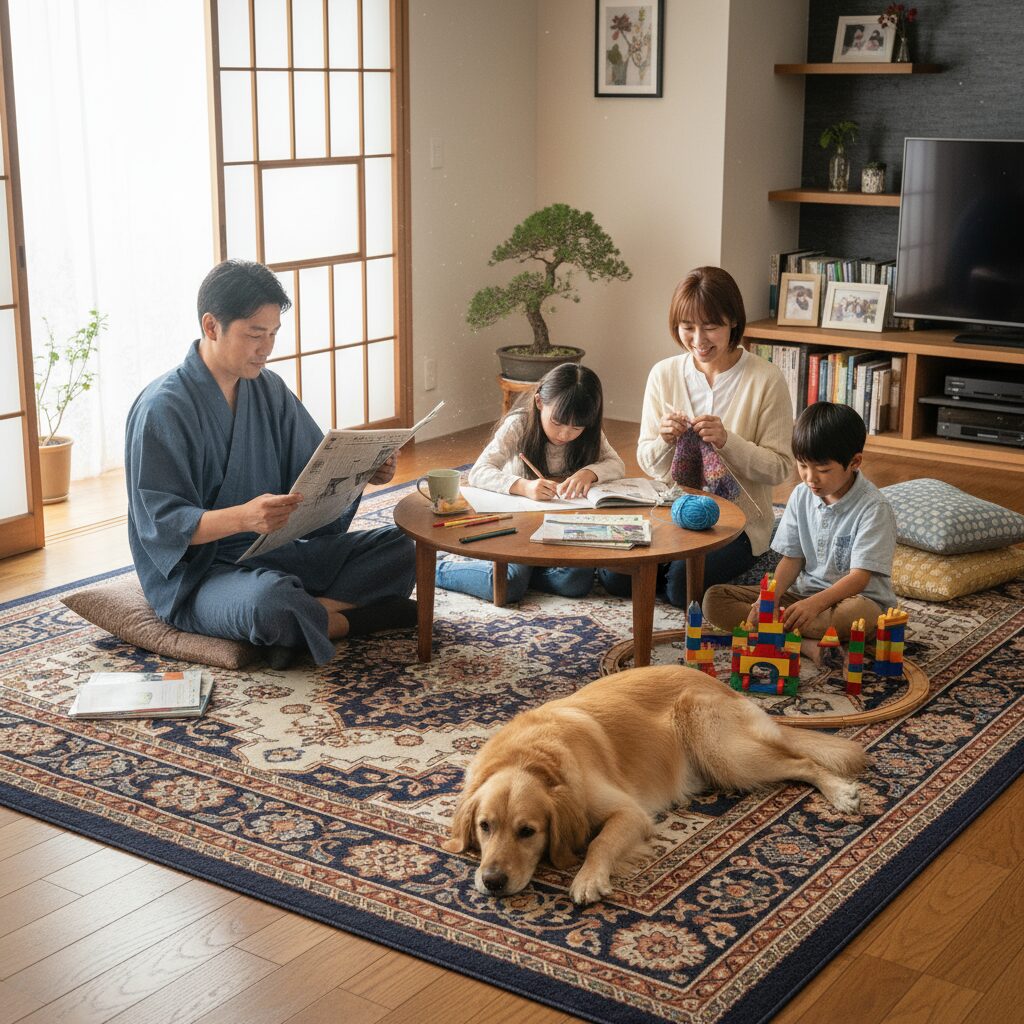 ラグの上では、いつも自然と家族が集まってきます。休日の午後、夫は新聞を広げ、私は編み物をしながら、子どもたちの様子を見守っています。長女の美咲は宿題に取り組み、次男の健一は積み木で遊び建物を作っています。そして、家族の一員である大型犬のゴールデンレトリバーのチャーリーも、いつもの場所でまどろんでいます。