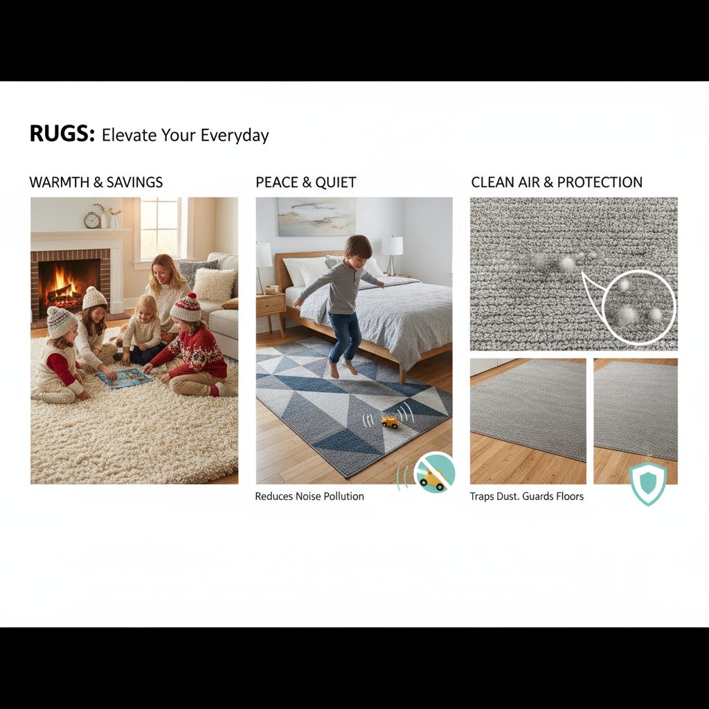 まず、ラグの最も基本的な機能として挙げられるのが、断熱効果です。床からの冷気を遮断することで、室内の温度を快適に保つ働きがあります。特に冬場は、フローリングからの冷気が気になるものですが、ラグを敷くことで足元から温かな空間を作り出すことができます。これは単に快適さを提供するだけでなく、暖房効率を上げることにもつながり、光熱費の節約にも貢献します。