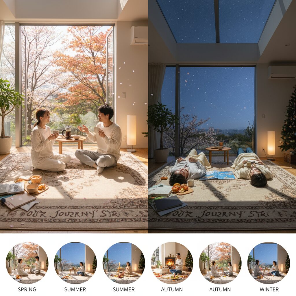 季節が変わるごとに、ラグの上での過ごし方も変化していきます。春には窓を開け放って、新鮮な風を感じながらピクニック気分でお茶を楽しみます。夏の夜は、冷たい麦茶を飲みながら星空の話に花を咲かせます。秋には、ラグの上で焼き芋パーティーを開き、冬には炬燵代わりに毛布を被って、二人で温かく過ごします。