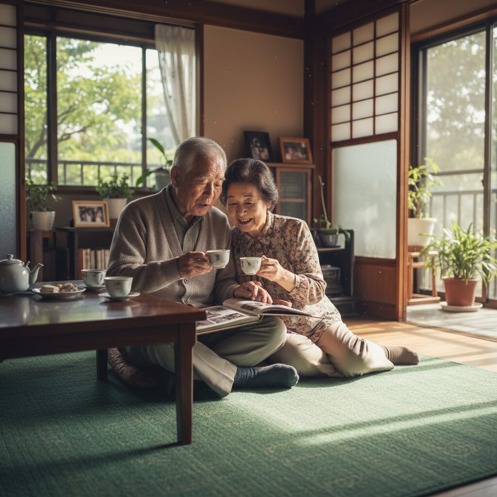 窓から差し込む柔らかな午後の光が、リビングのラグの上で優しく揺れている。その温もりの中で、結婚して五十年になる老夫婦は、今日もお気に入りの椅子に腰を下ろし、湯気の立つ湯呑みを手に取った。夫が淹れた番茶の香りが、静かな部屋に広がっていく。
